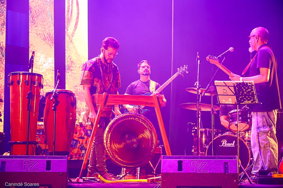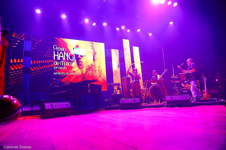 A 23ª edição do Prêmio Hangar de Música convida o público para uma experiência sensorial que atravessa tempos, territórios e imaginários. Guiado pelo Afrofuturismo e em homenagem ao legado de Naná Vasconcelos, o espetáculo se constrói como uma jornada onde ancestralidade e futuro se encontram em cena. A abertura estabelece o tom da noite com a Banda Base Hangar, em uma ambiência sonora que reverencia o mestre homenageado, conectando tradição, tecnologia e invenção musical.